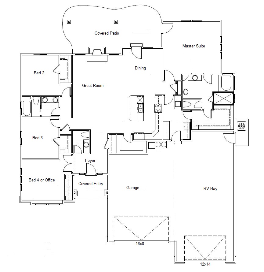 PDF Flyer Back Elevation A Dayton RV Single Story Beds: 4 Baths: 2.5 Garages: 4 Sq Ft: 2,245 Extras: RV Garage Floor Plan A